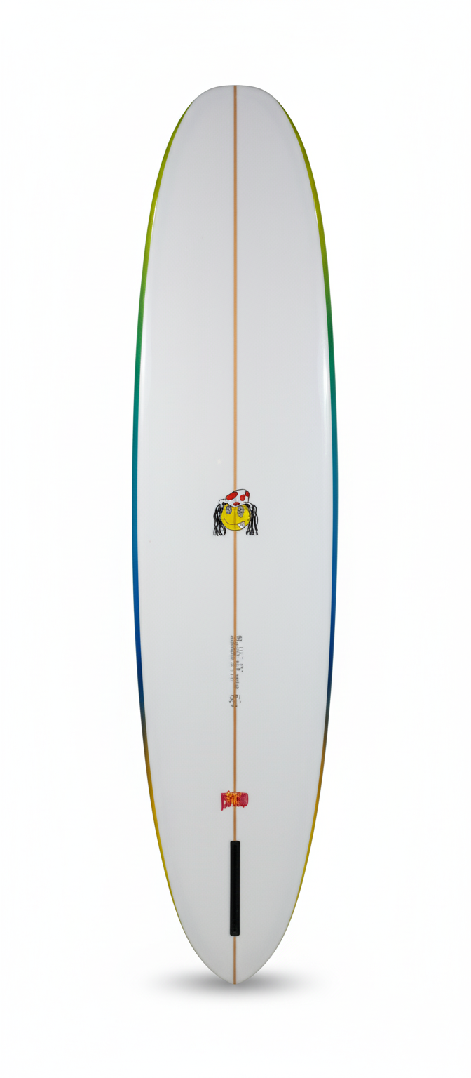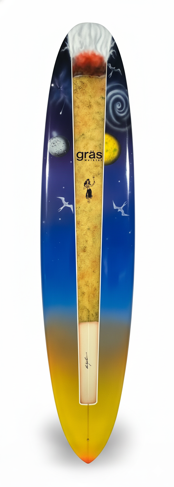 The Burning J is a hand-shaped 8’0 longboard featuring an airbrushed cosmic deck with smoke, planets, and deep blue fades. It’s a board for cruisers — blending art and surf in one. Smooth nose rides, mellow lines, and pure Waikīkī vibes.